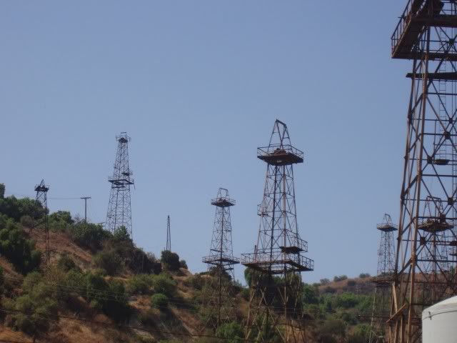 There's a section in Brea Canyon, near my house, that has some of the older fashioned oil derricks- the towers, as opposed to the "grasshopper" types. I took the family's digital cam out with me the other day, and took some pictures.