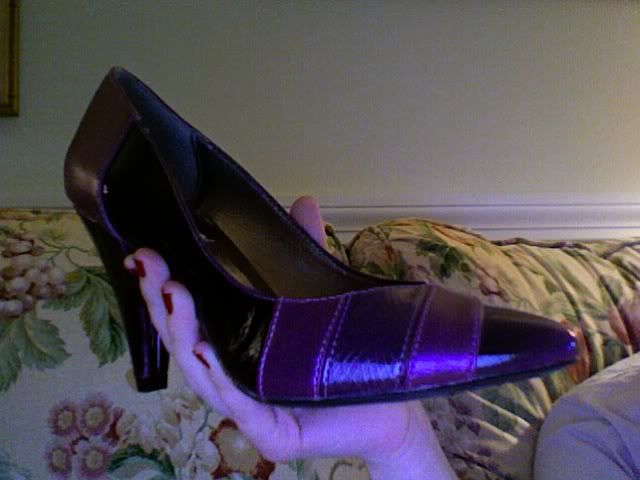 Today is my first day back at my old job, so I get to dress up! The place where I was working was as casual as you want, so I went to work every day in jeans and Chucks or flip flops, but I'm very happy to be going back to a place where the dress code is business casual. In celebration, I'm wearing my favorite purpleheels.