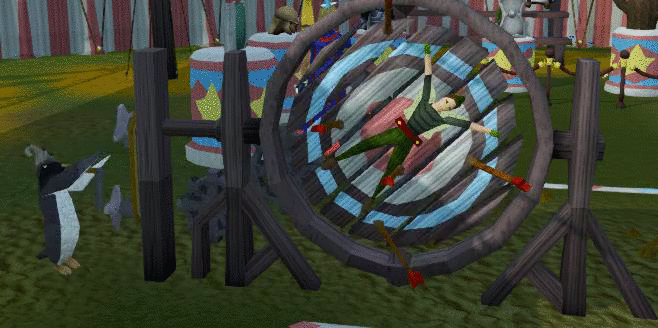 The lady, the penguin, and whoever's shooting arrows at her are all part of a circus act.